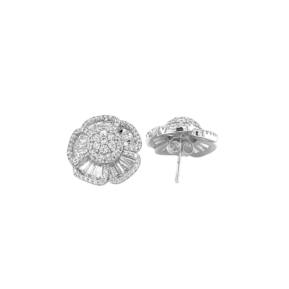 These earrings are crafted from 925 sterling silver and adorned with stunning round and baguette...