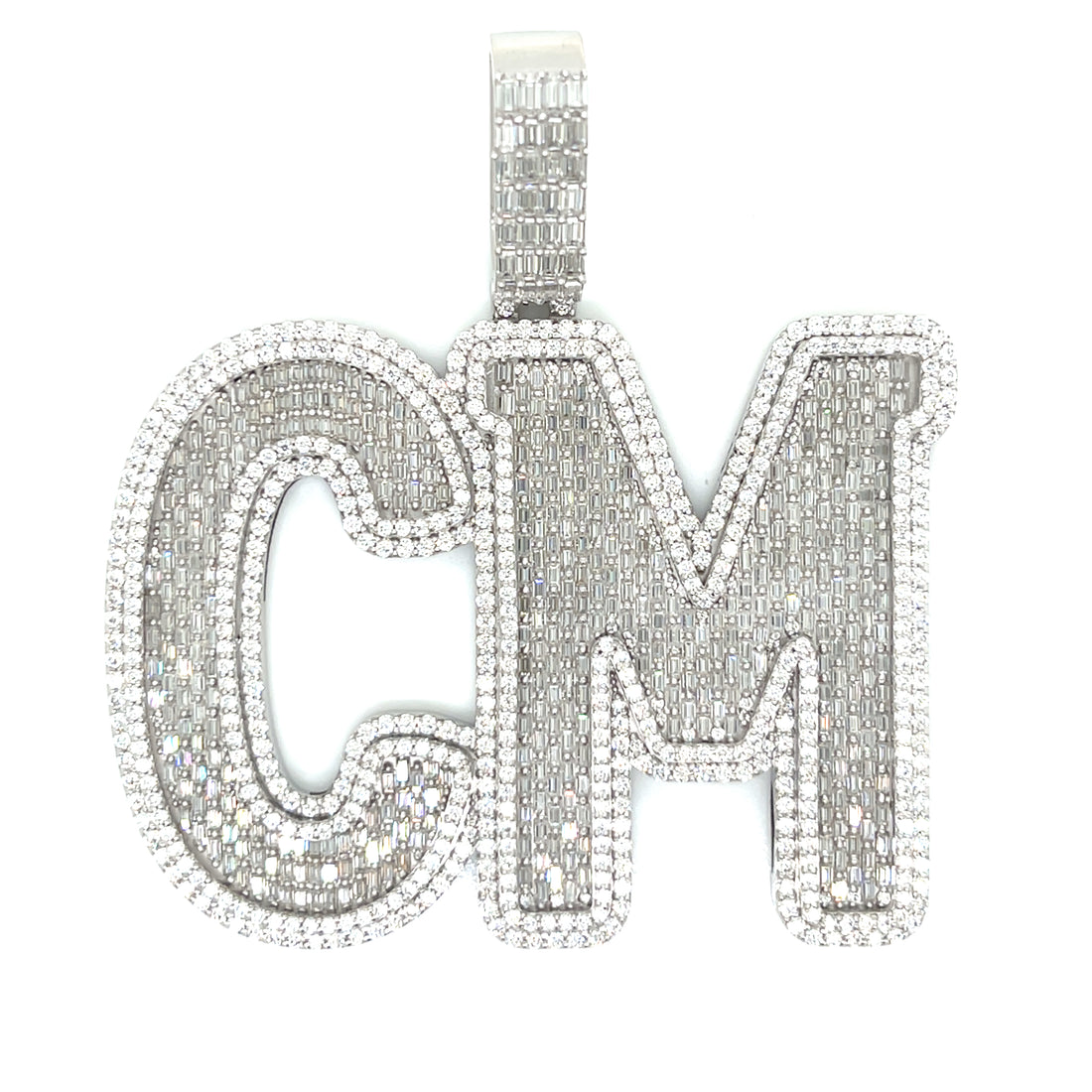 This custom CM pendant showcases oversized block letters fully iced with hand-set stones from edge...