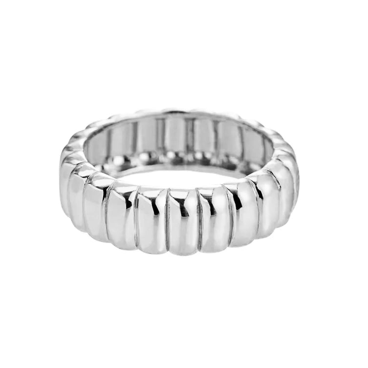 Sleek ribbed band ring crafted in genuine sterling silver with a high-polish finish. The bold...