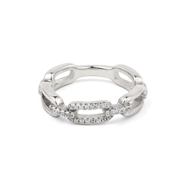 Modern open link chain ring crafted in genuine sterling silver and accented with sparkling cubic...