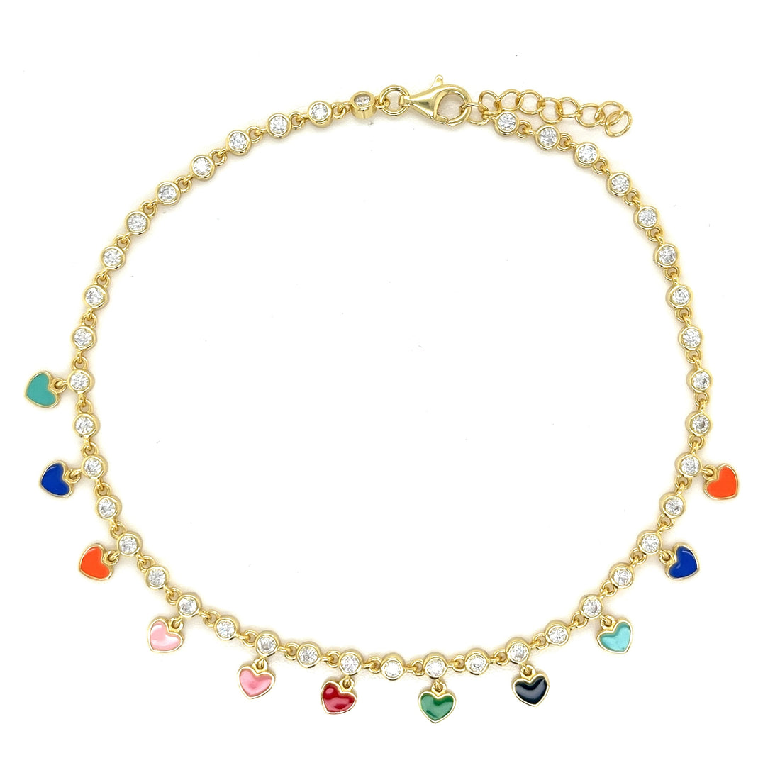 Sterling Colored Enamel Dangling Heart Anklet Zirconia