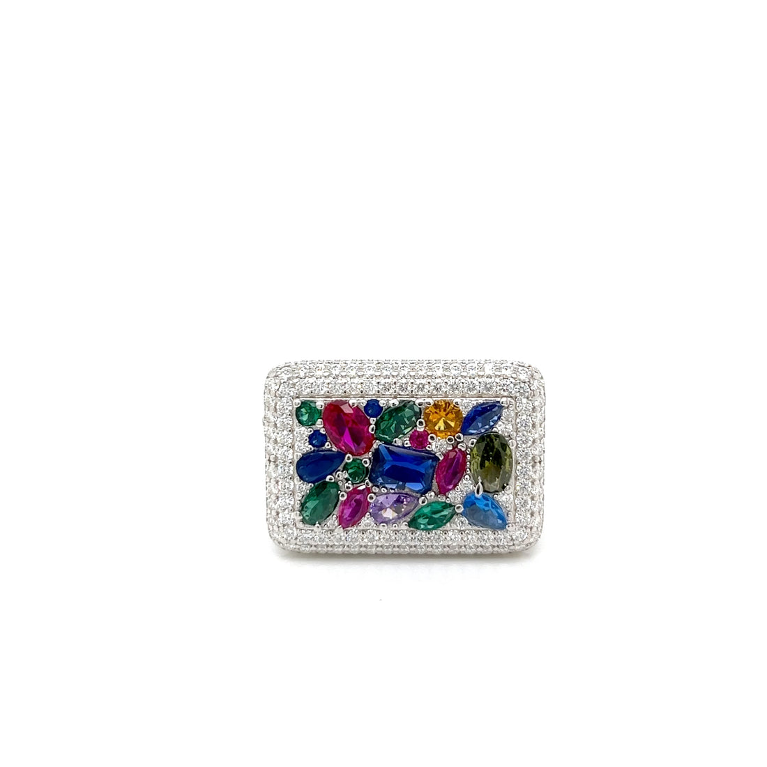 This sterling silver statement ring showcases a fully iced square face with a raised center...
