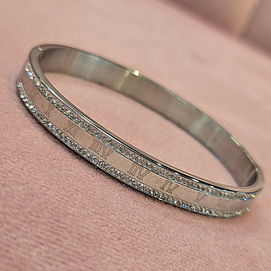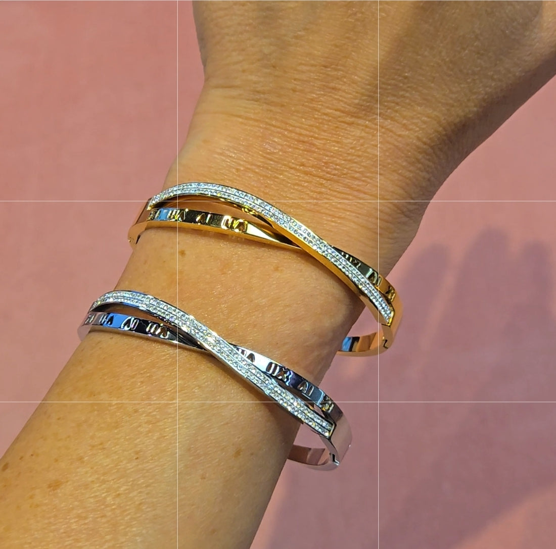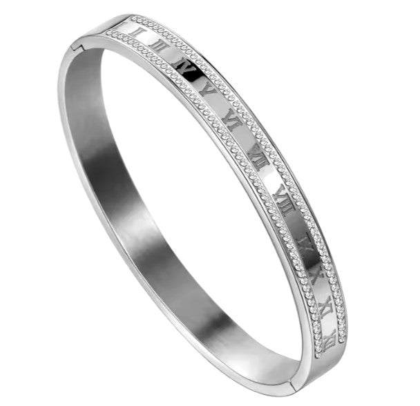 Roman Numerals Interleaved CZ Stainless Steel Bracelets Bangles