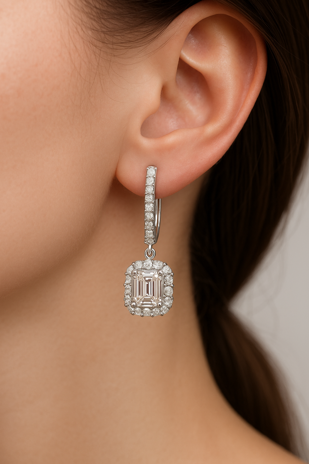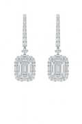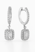 Radiant Elegance Emerald-Cut Halo Drop 18k White-Gold Earrings