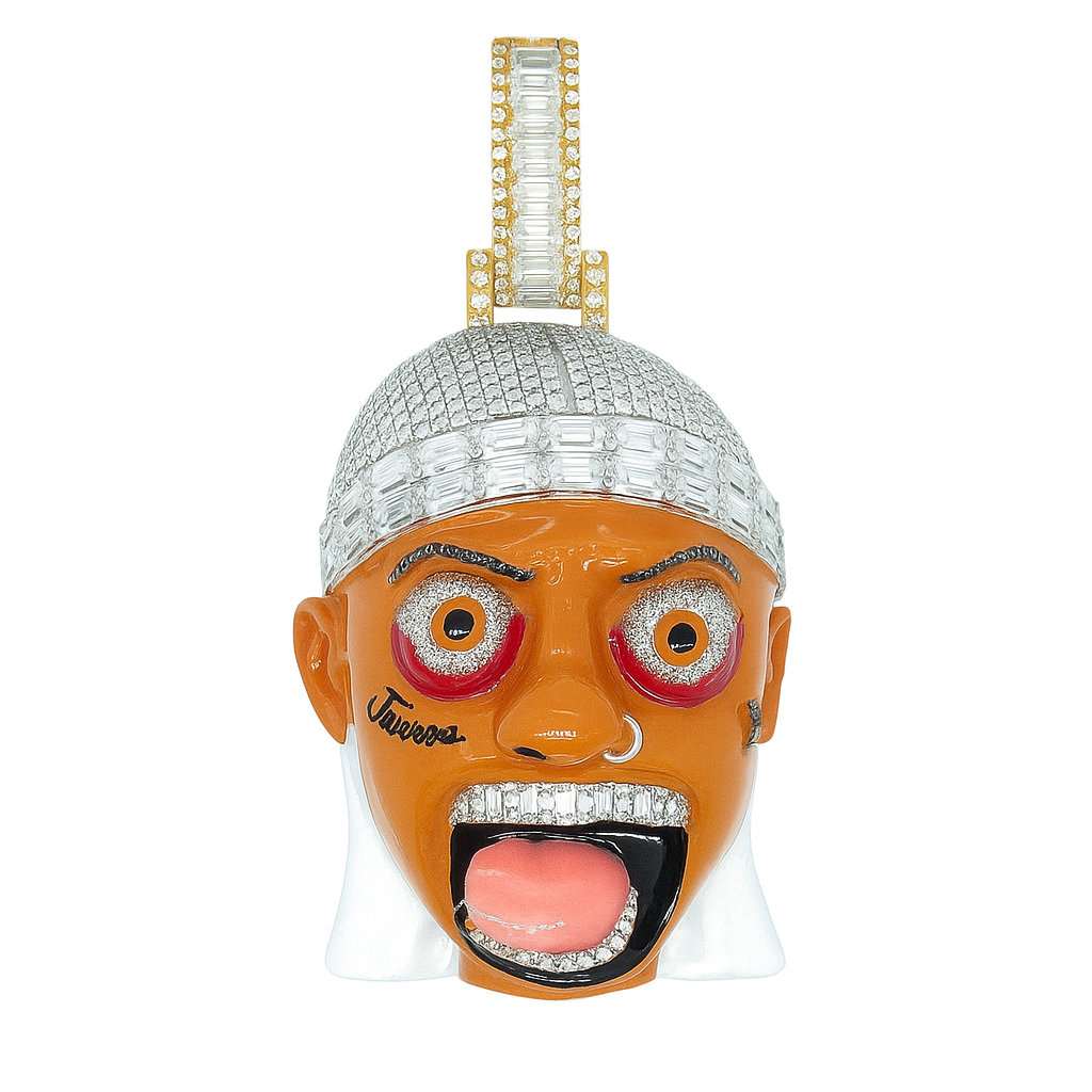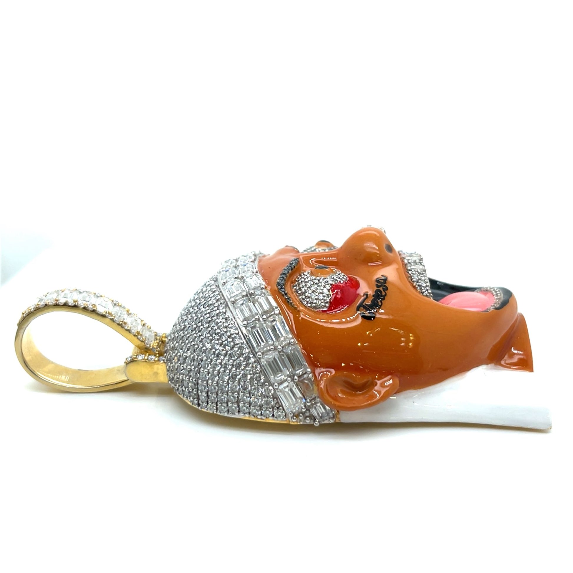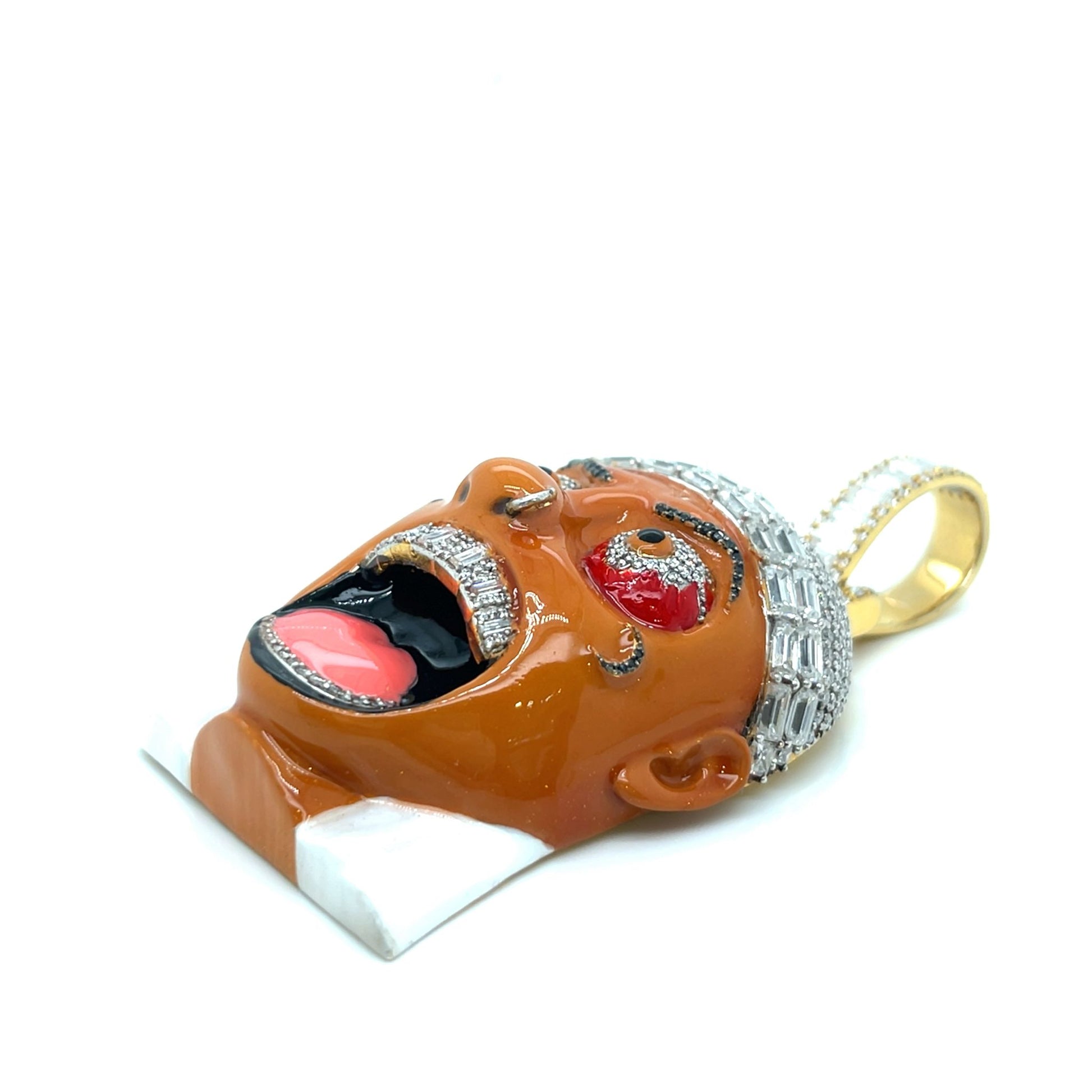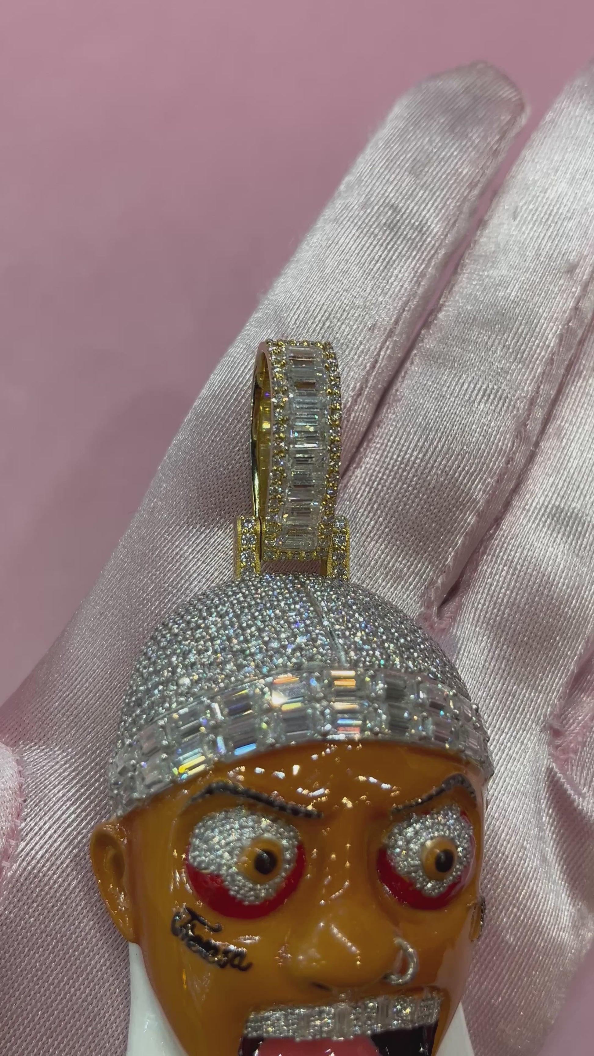 Turn heads with this bold iced-out custom character pendant, crafted from solid sterling silver and finished with rich gold plating. Fully encrusted with brilliant moissanite stones that outshine diamonds, this unique design showcases a detailed expressive face with a diamond-set cap, sparkling bale, and enamel accents. A true statement piece for collectors and trendsetters, this pendant brings luxury, artistry, and personality together in one unforgettable design.