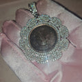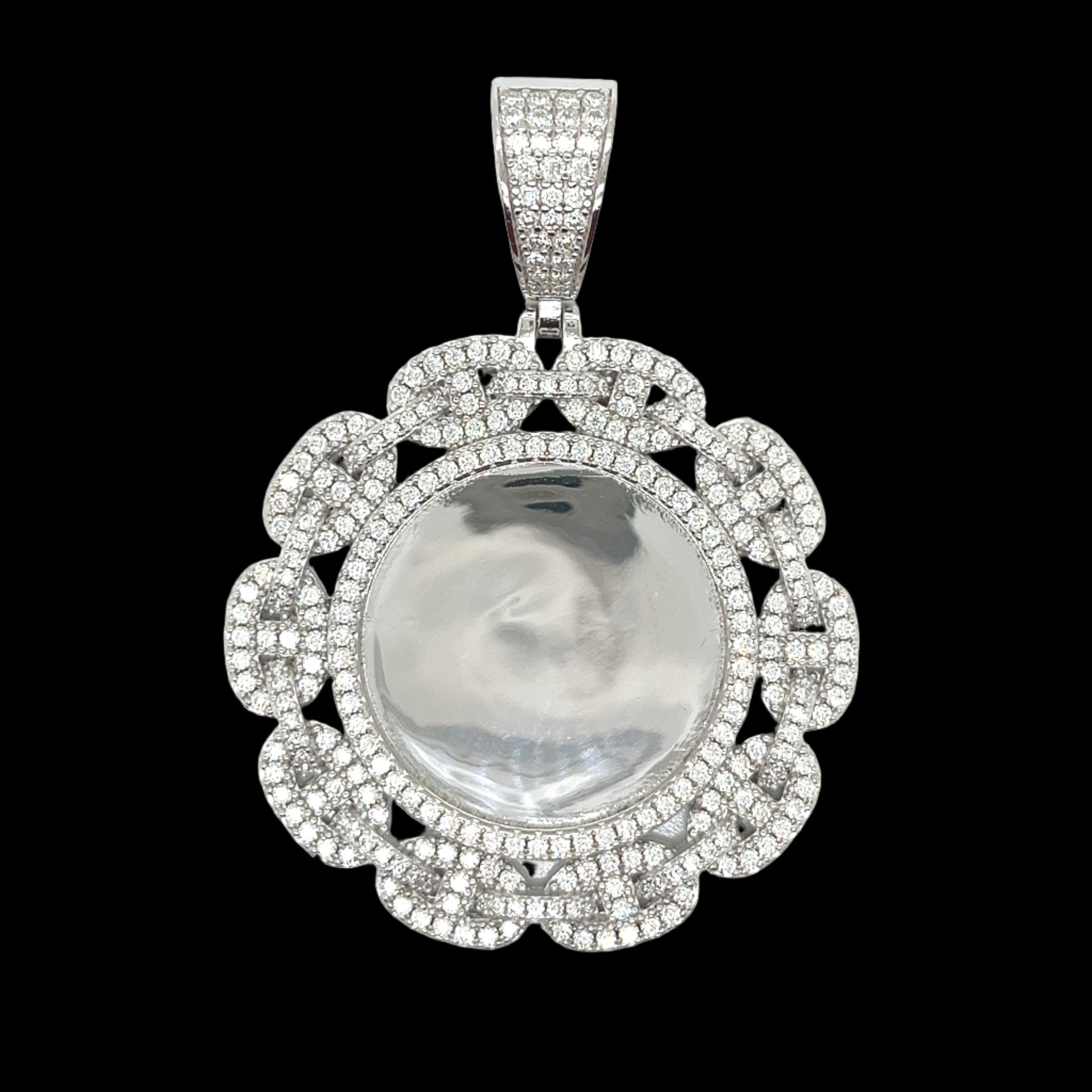 Colgante con forma de imagen redonda de plata de ley 925 adornado con aprox. 4.34CT de piedras Baguette y MOISSANITE redondas. Este colgante de 2,5" x 2" irradia sofisticación. Diseñado para una durabilidad duradera y un estilo inigualable.