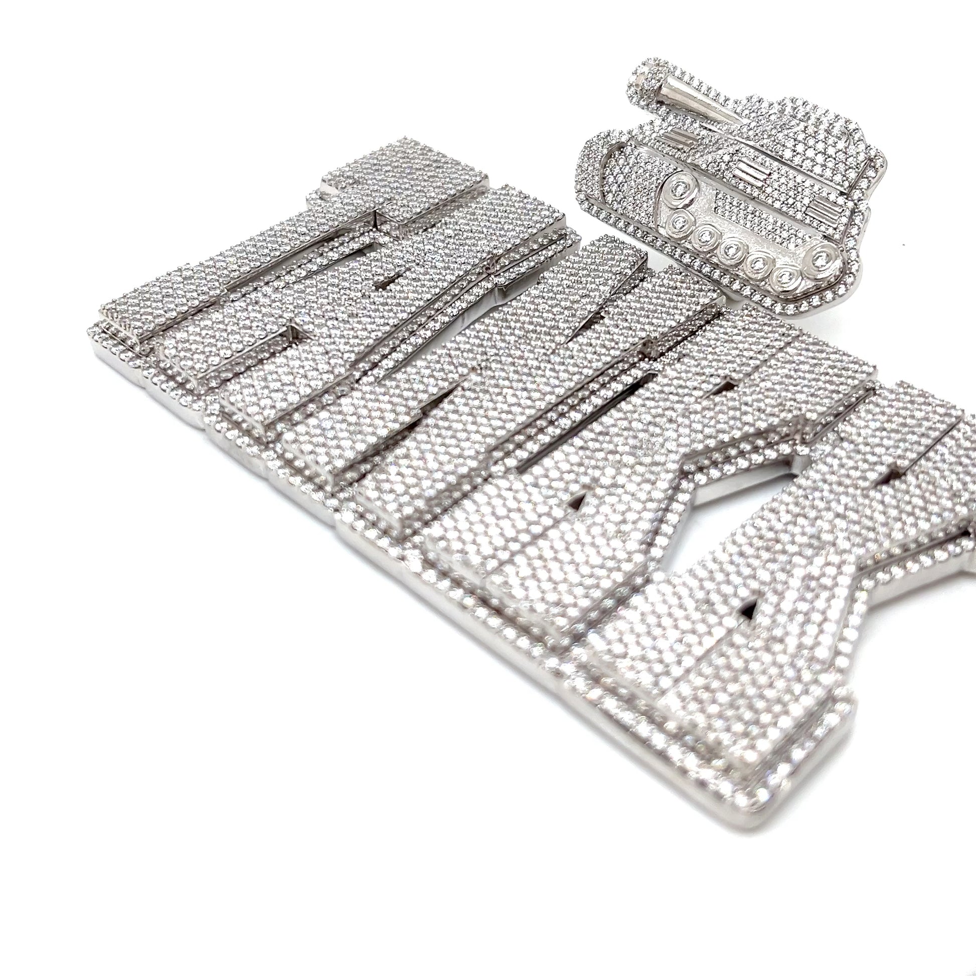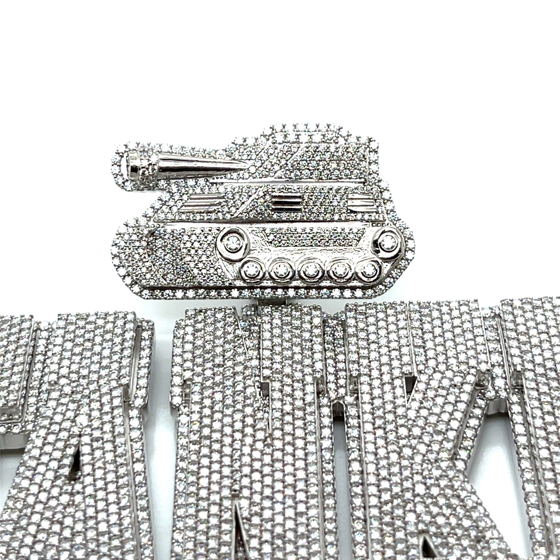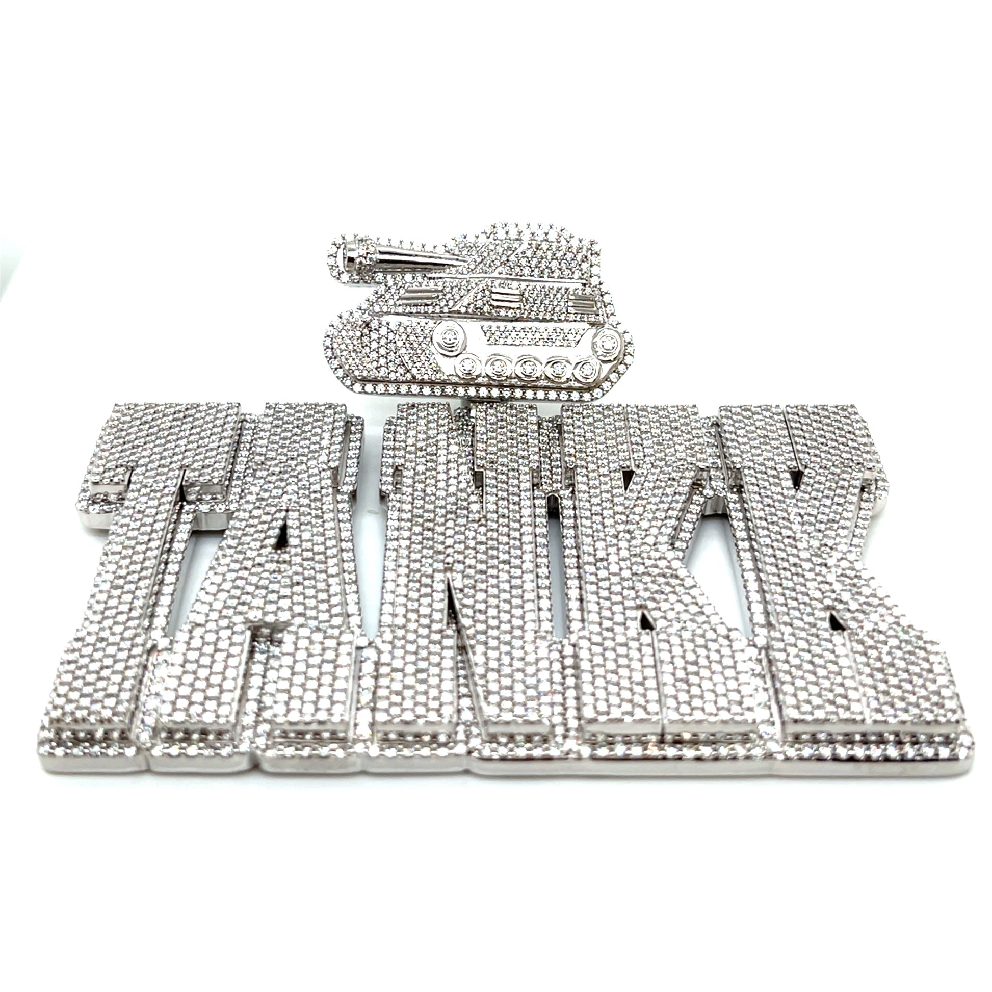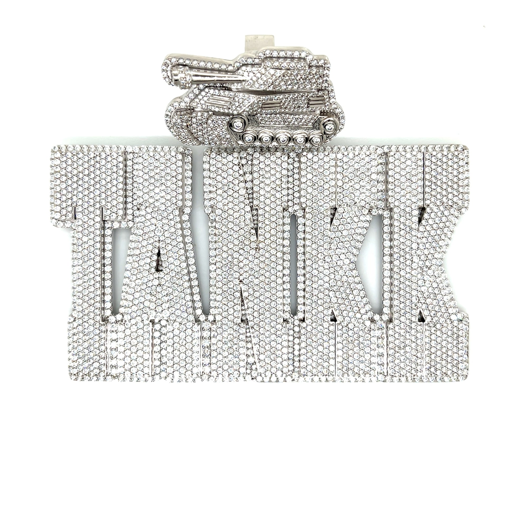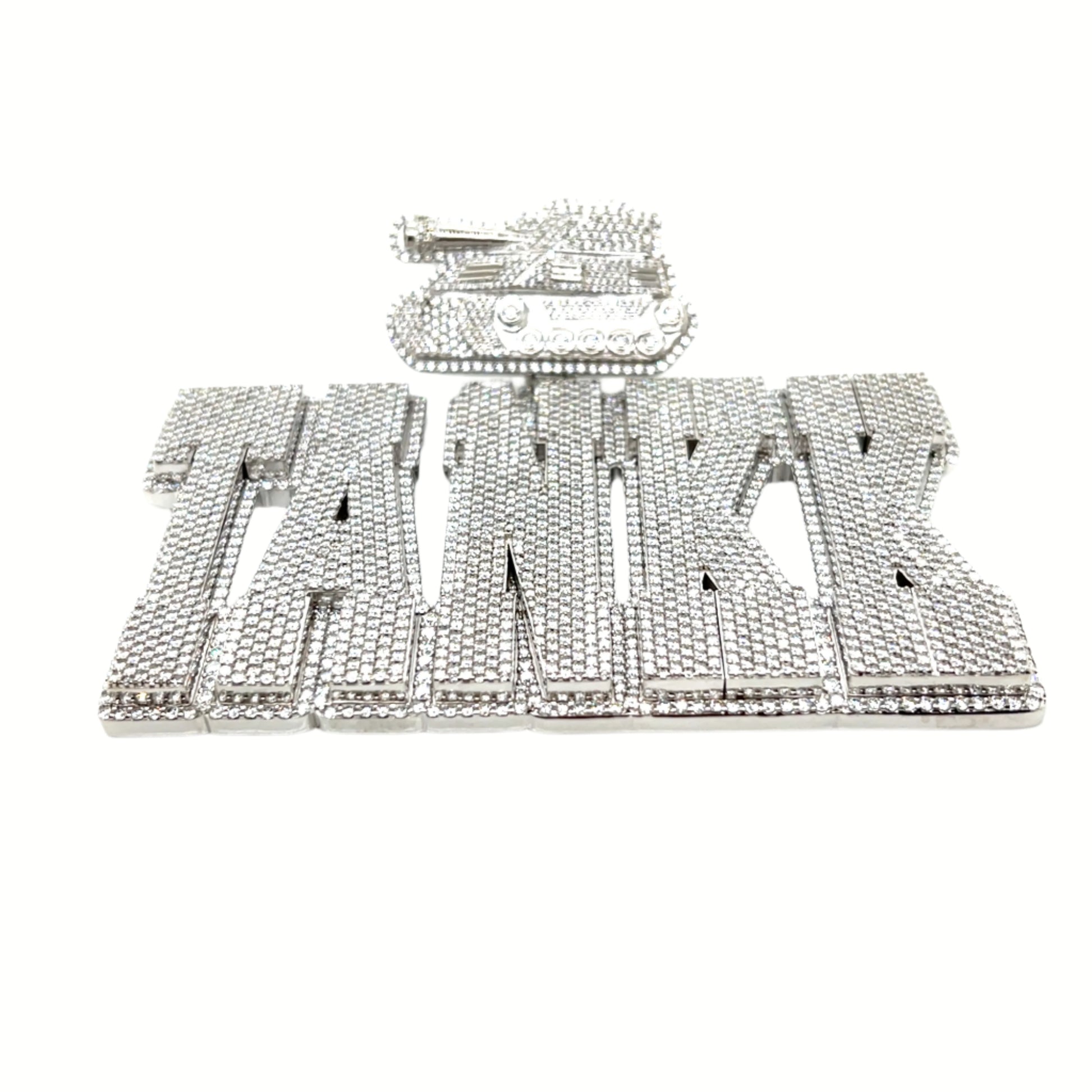 Command attention with this bold Silver TANK Pendant, crafted from solid sterling silver and fully iced with round-cut lab-created Moissanite stones for intense brilliance and fire. Built to last with a non-tarnishing finish, this pendant combines rugged power with high-end shine — the perfect piece to showcase strength, style, and standout confidence.