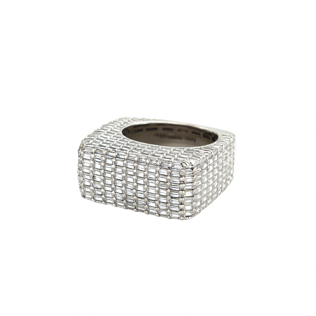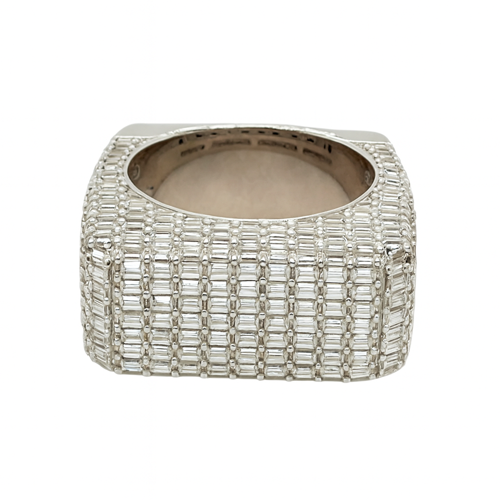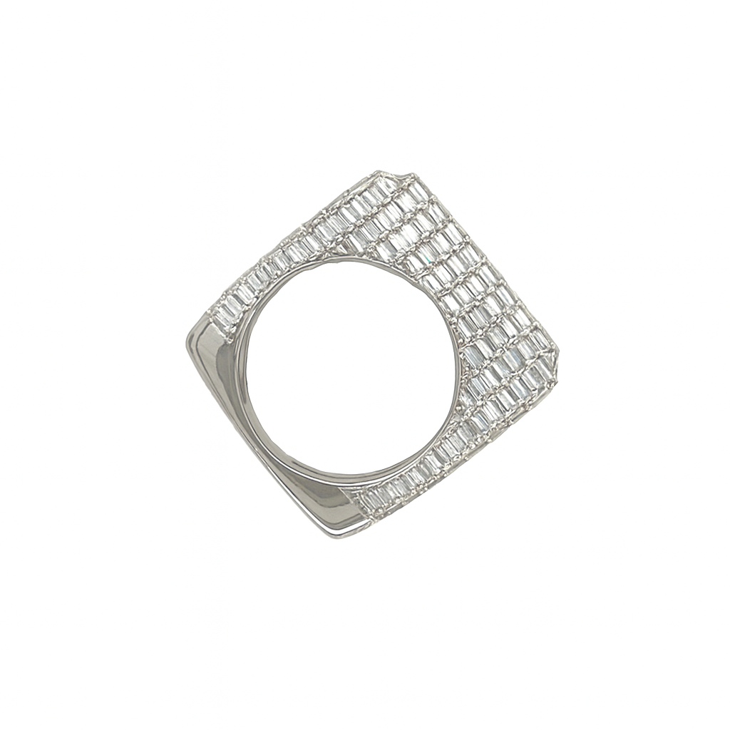 This standout ring, made from 925 sterling silver, showcases a striking square design. It sparkles with about 5.26CT of emerald-cut lab-created moissanite stones, carefully arranged for a rich, textured look. The geometric shape combined with the dazzling moissanite makes it a fun and fresh accessory for anyone wanting a bold, modern vibe. Finished in white silver with rhodium plating for extra shine and durability.