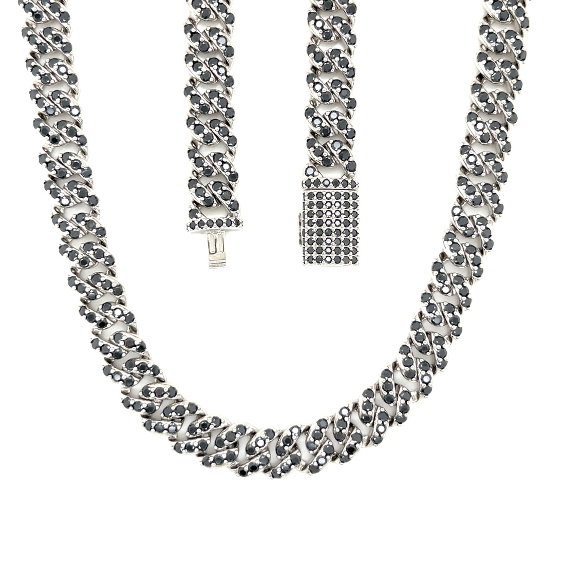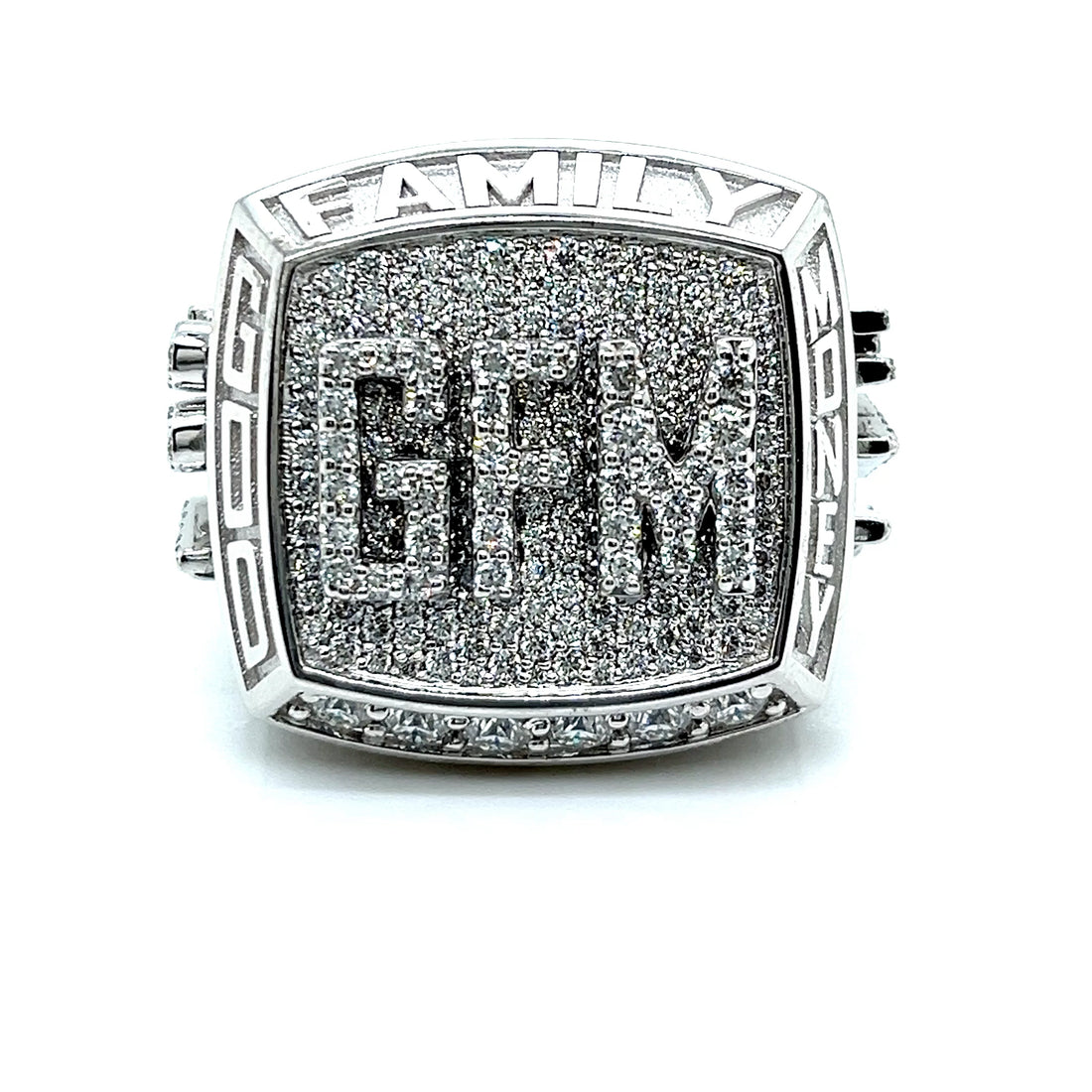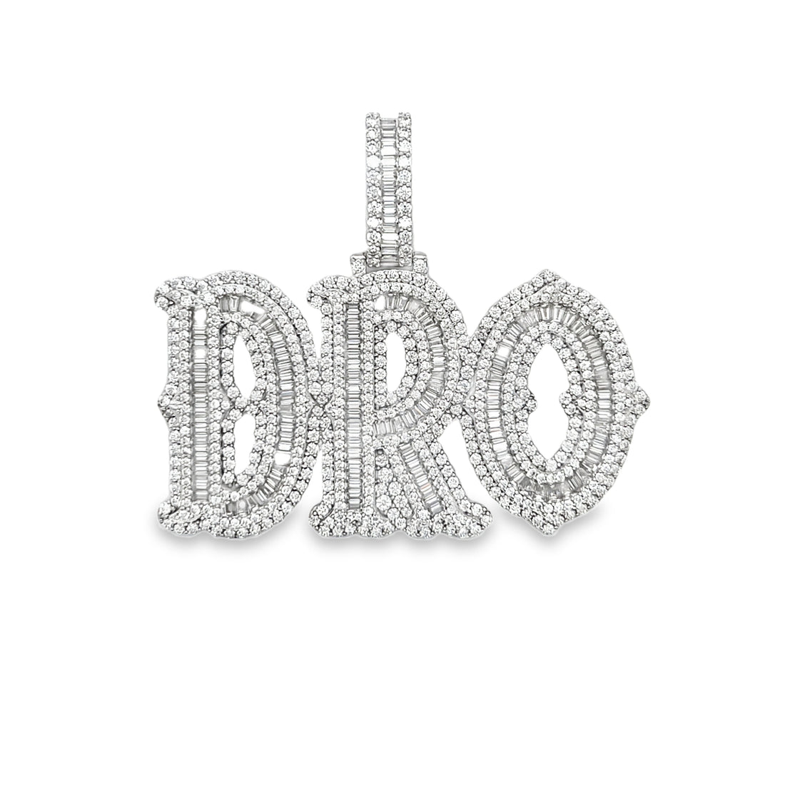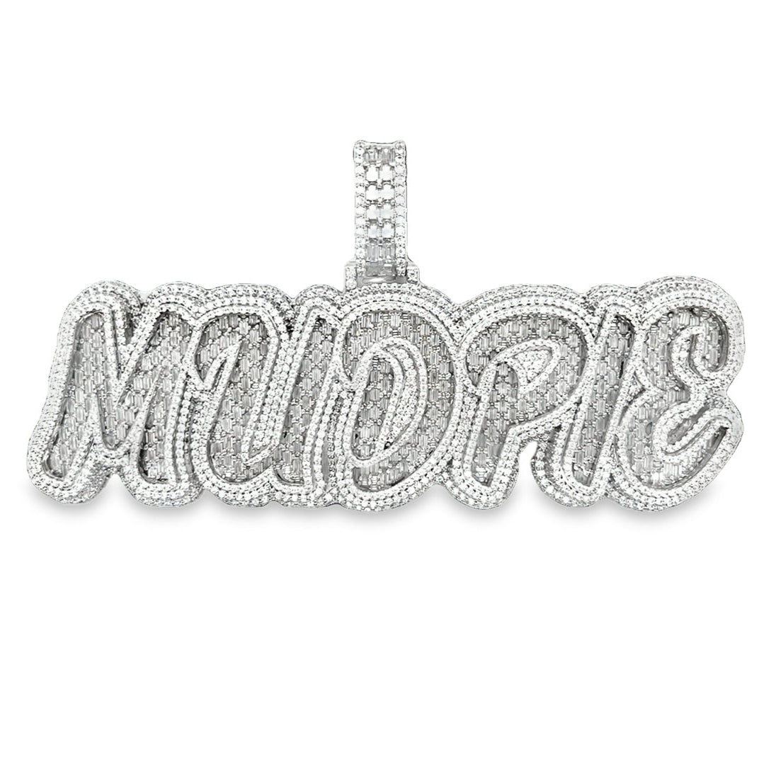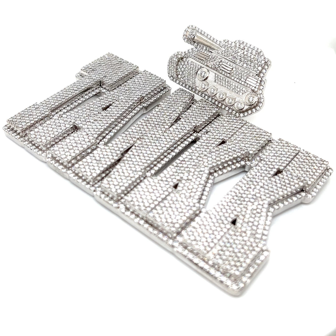 This custom CM pendant showcases oversized block letters fully iced with hand-set stones from edge...