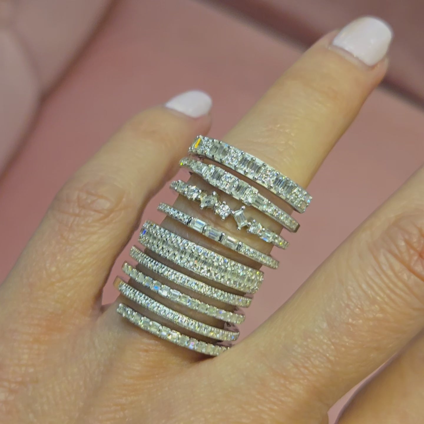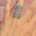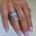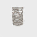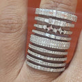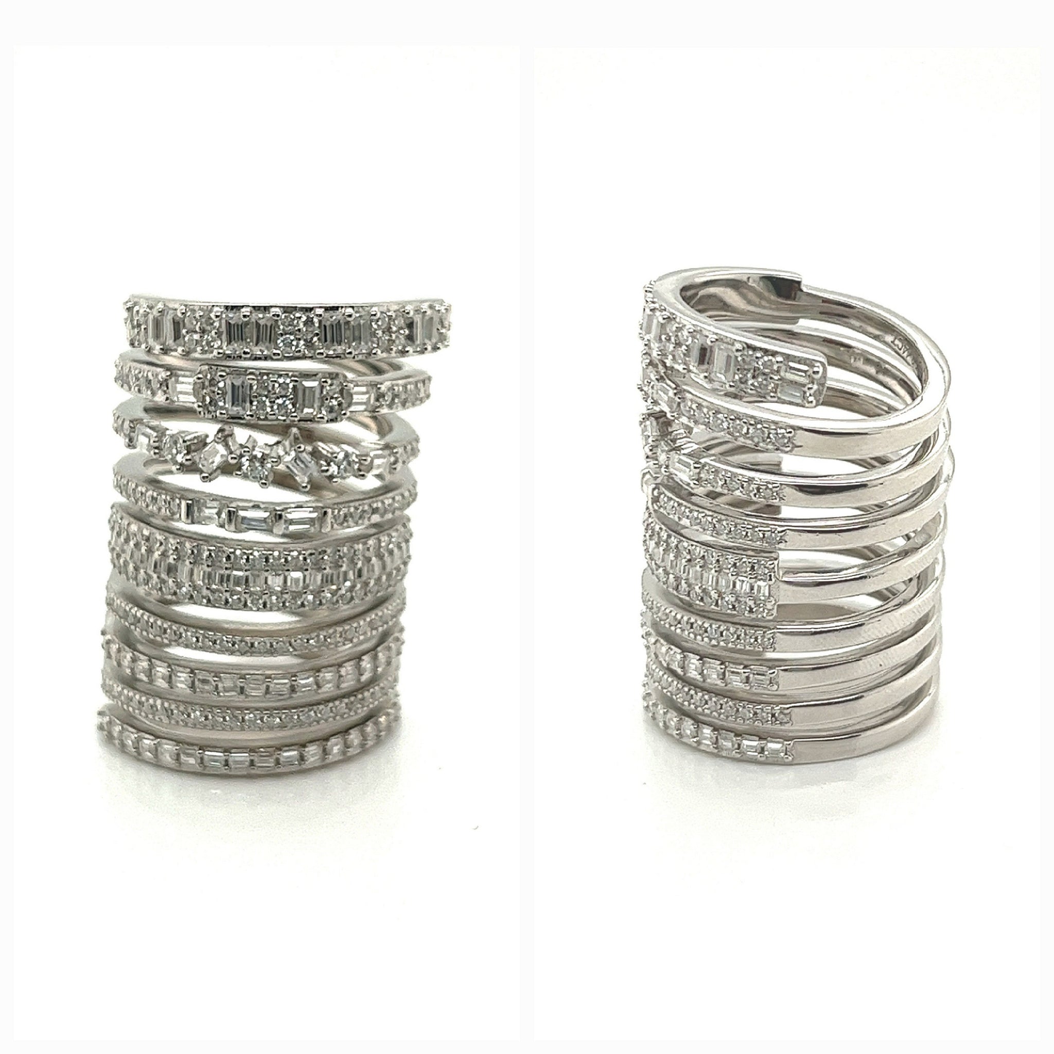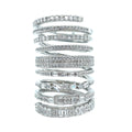 This exquisite spiral ring is crafted from 925 sterling silver, featuring an intricate design with multiple layers that wrap elegantly around the finger. Each band is adorned with sparkling approx. 3.44CT lab-created moissanite stones, arranged in various cuts and sizes to create a dazzling effect. The layered structure adds depth and dimension, while the shimmering stones catch the light beautifully. This ring exudes modern elegance and sophistication, making it a perfect statement piece for any occasion. Its unique design allows it to stand out, offering a fresh take on classic luxury. Color: White Silver Rhodium Plated for increased durability. Fast Shipping Worldwide!