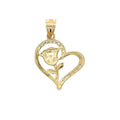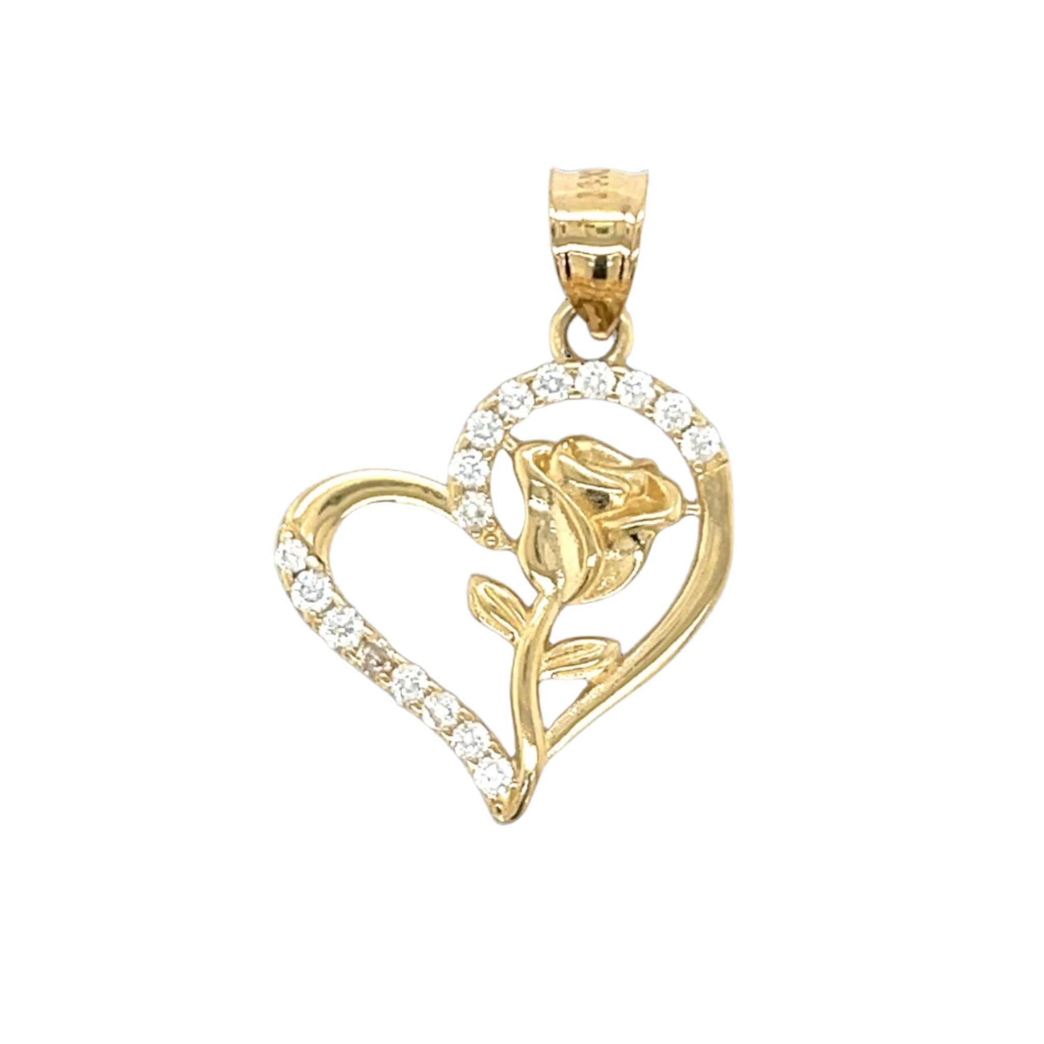 Transform your style with the exquisite 14K Gold Rose in Heart Pendant, weighing around 2.5G. Adorned with stunning Cubic Zirconia Stones, this timeless masterpiece radiates sophistication and allure.