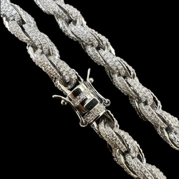 Stunning Sterling Silver Iced Out Rhodium 8MM Rope Chain: Elevate your style with this timeless beauty. Featuring dazzling approx.15.55CT for 18" of Round Moissanite Stones, it adds a touch of glamour to any look.