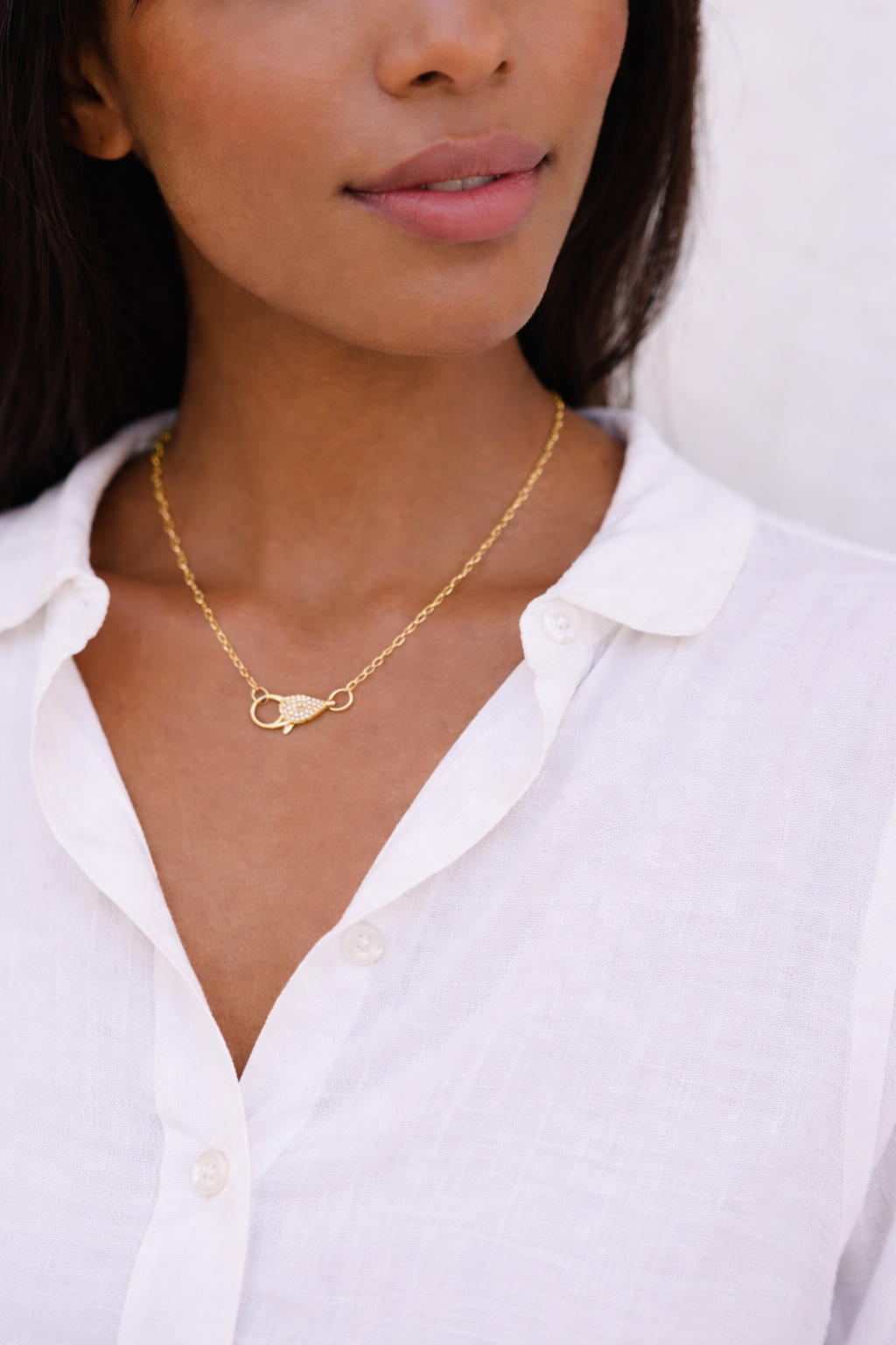 Sterling silver 16" necklace featuring a pavé cubic zirconia lock pendant on a modern link chain. Designed as both a focal point and functional detail. Available in silver or gold tone.