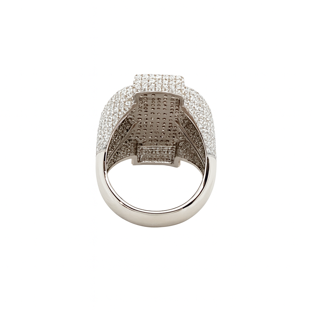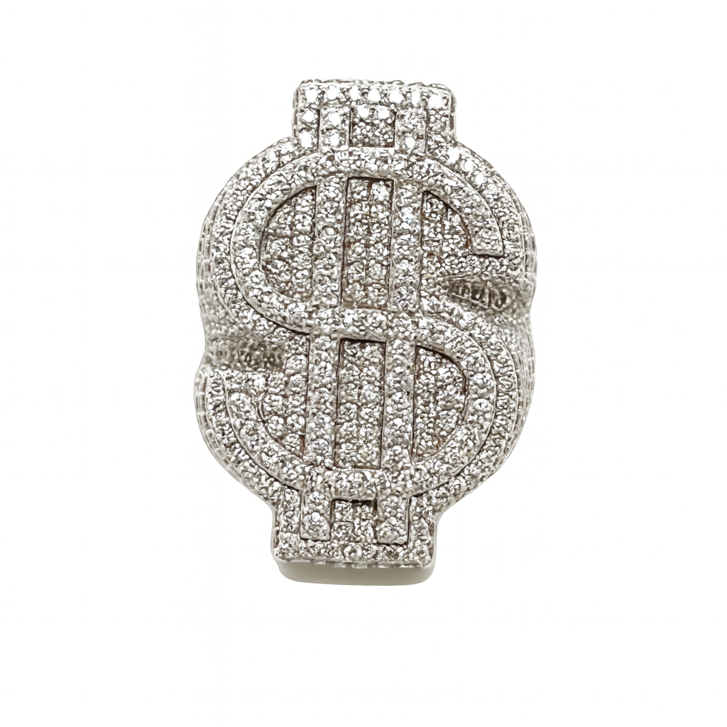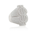 This sterling silver ring shines bright with a sparkling dollar sign made from 6.27CT lab-created moissanite stones. Coated in white silver rhodium, it’s built to last and ready to add some playful sparkle to your style.