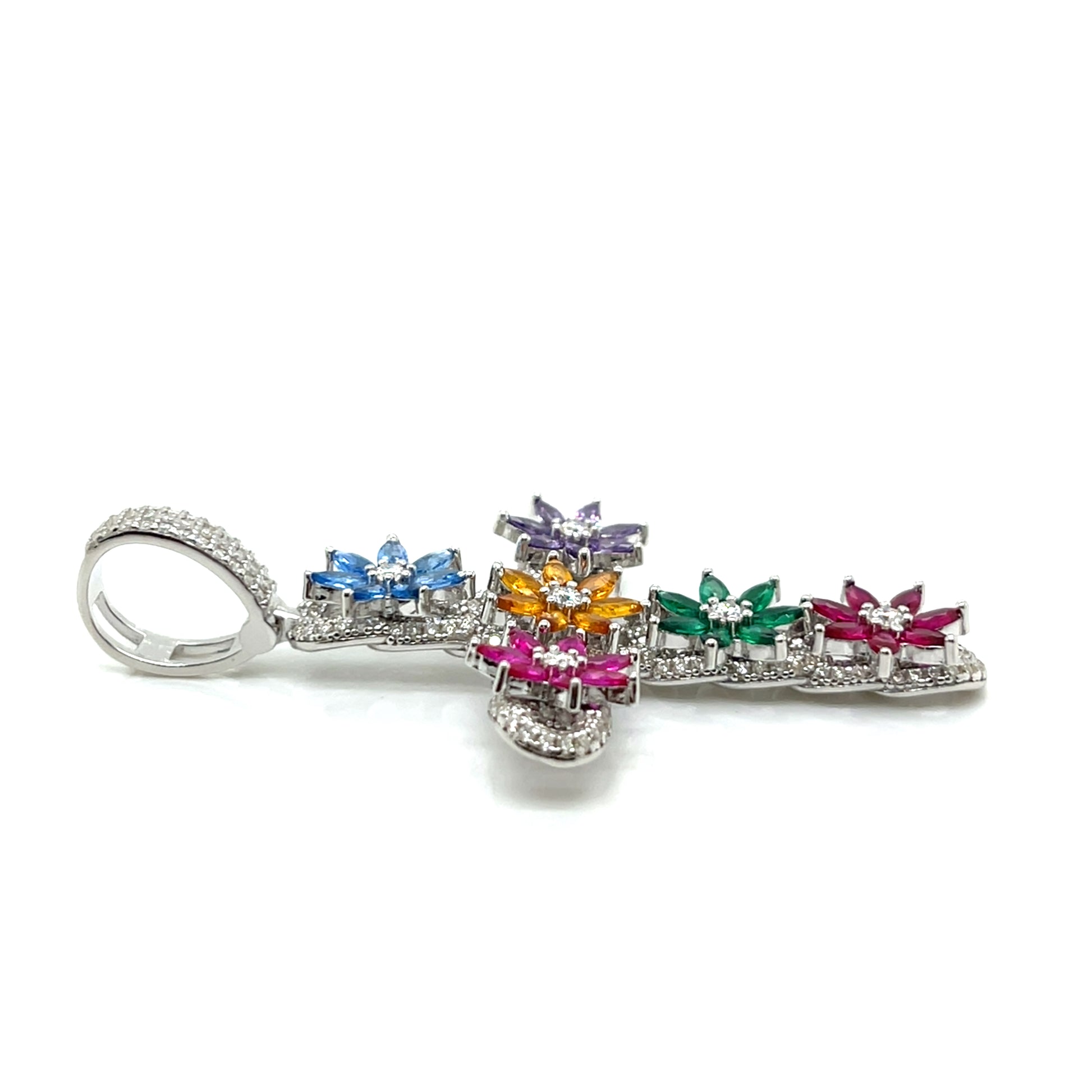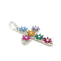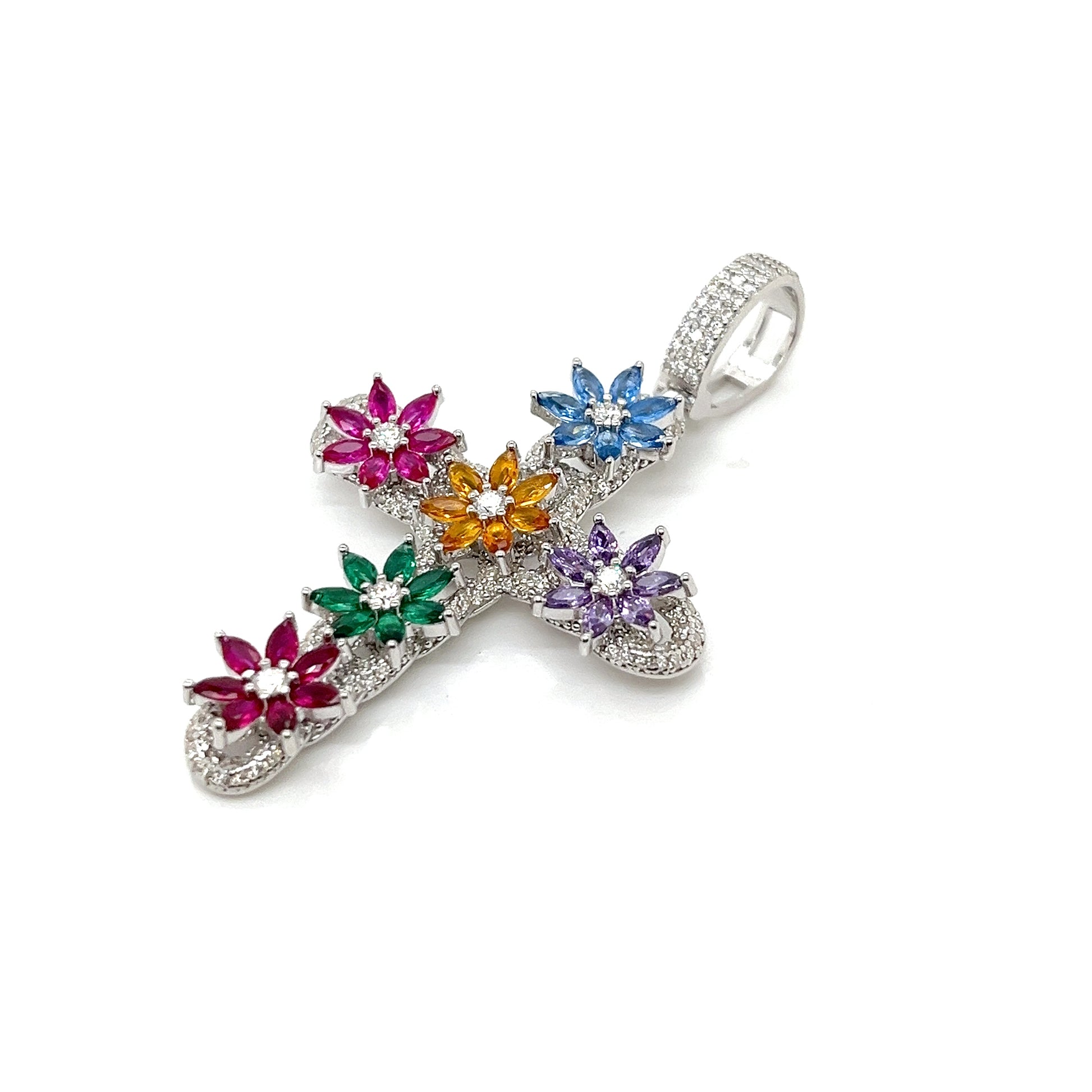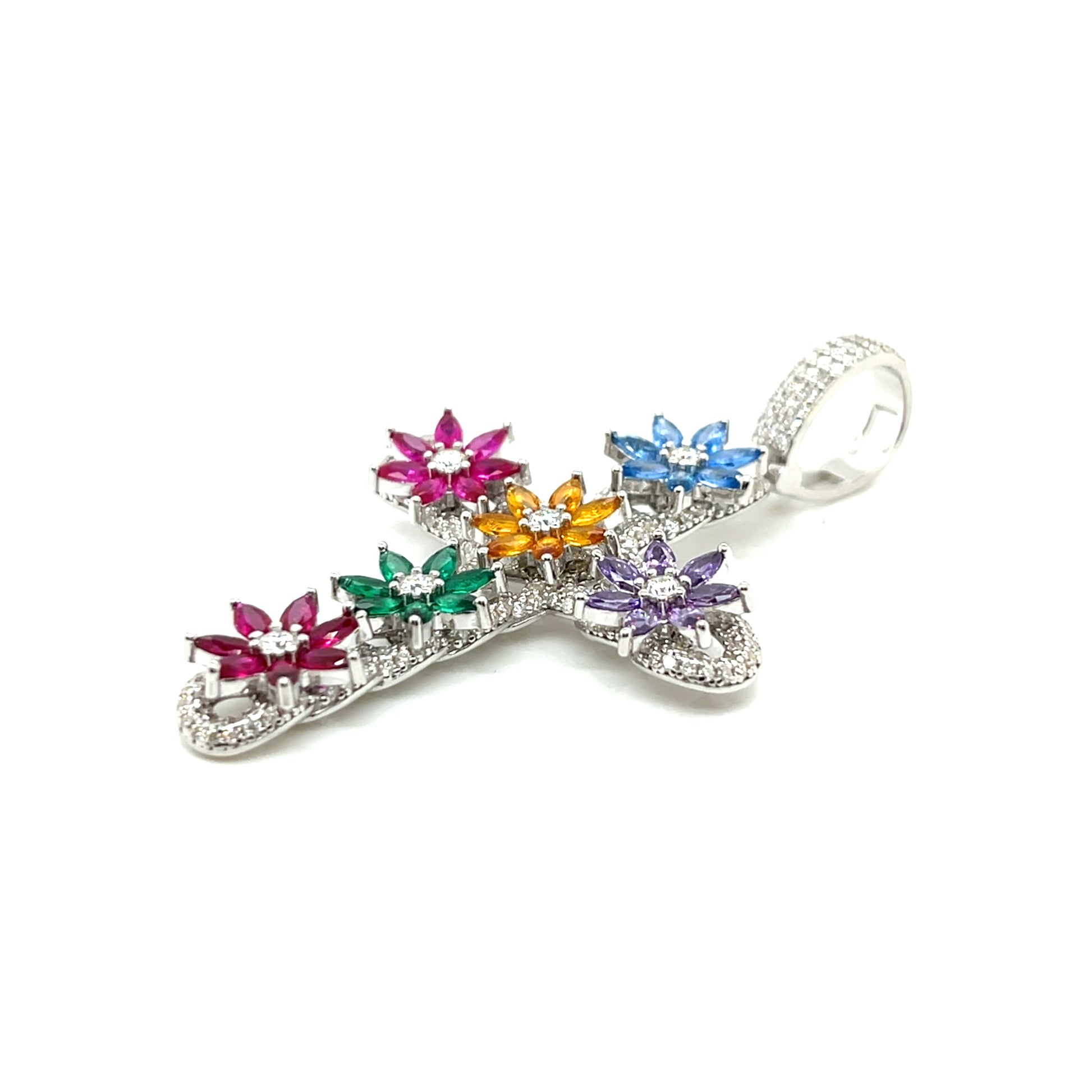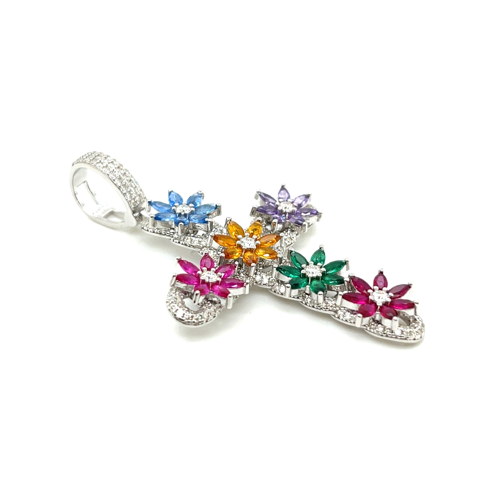 Floral Cross Pendant in Sterling Silver with Moissanite & Multi-Gem Accents