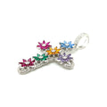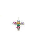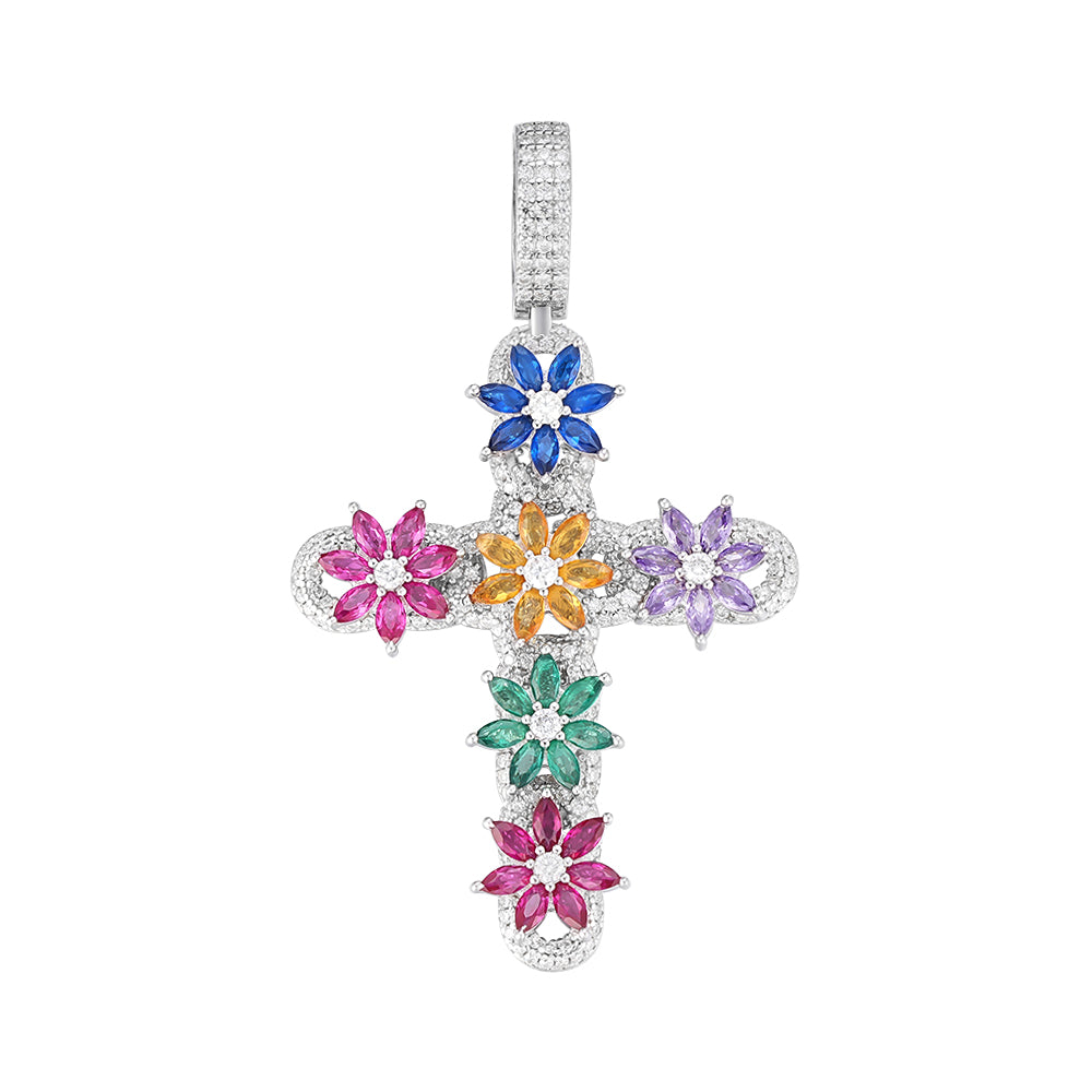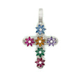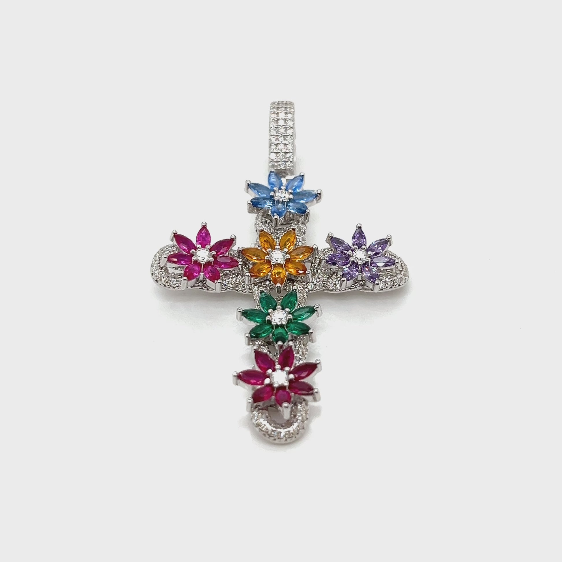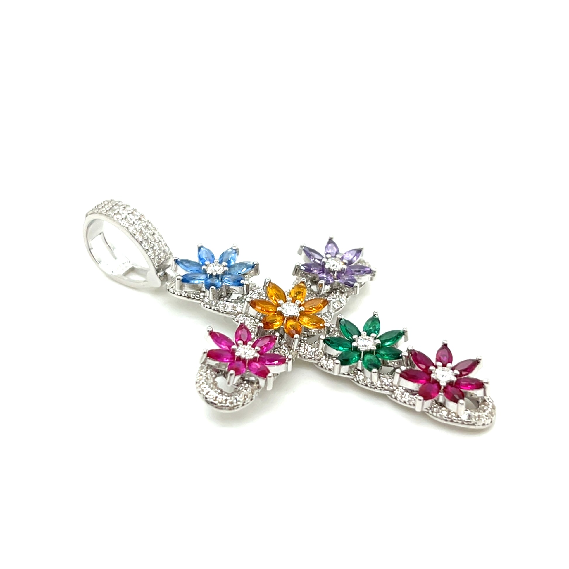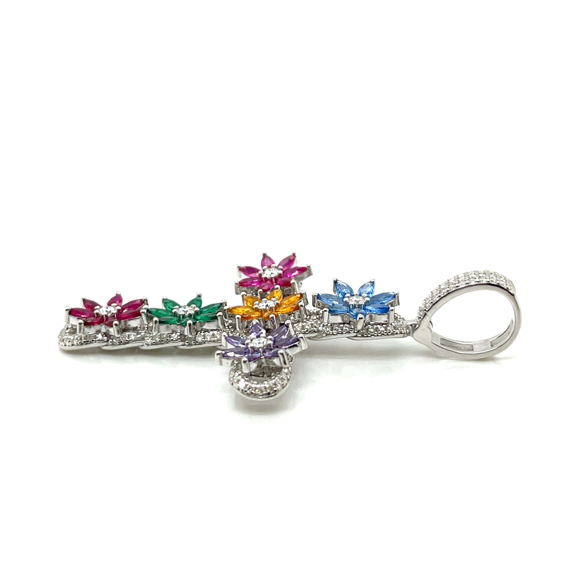 Floral Cross Pendant in Sterling Silver with Moissanite & Multi-Gem Accents