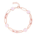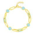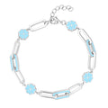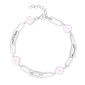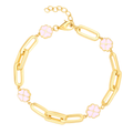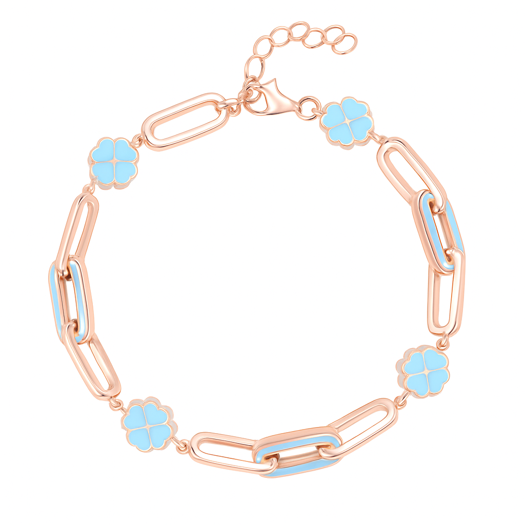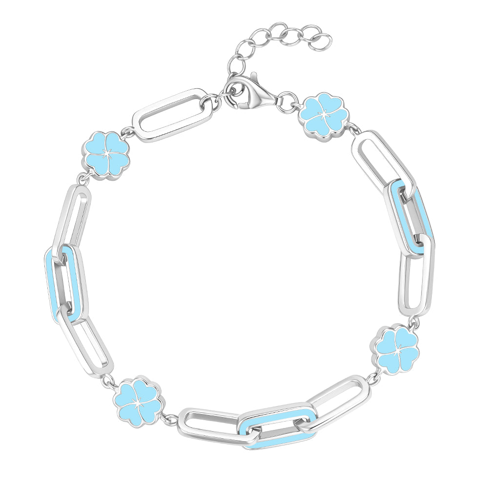 Elegant and playful, this sterling silver bracelet features a modern paperclip chain adorned with reversible flower charms—pink enamel on one side and blue enamel on the other. The bracelet measures 6.5 inches with an additional 1-inch extension for a comfortable fit up to 7.5 inches. Available in silver, gold-plated, and rose gold-plated finishes, this charming piece pairs beautifully with the matching double-sided flower necklace.