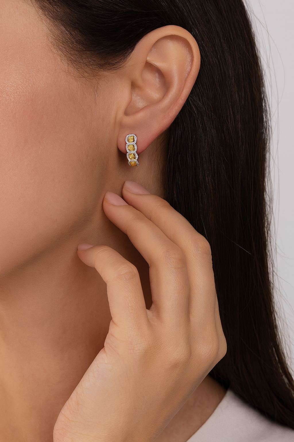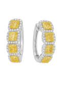 These exquisite 18K yellow and white gold hoop earrings feature a captivating blend of brilliance and sophistication. Adorned with 8 vivid yellow diamonds totaling 2.05 carats, surrounded by 0.40 carats of dazzling white diamonds, each cushion-cut yellow diamond radiates warmth and luxury. The white gold setting enhances the contrast and sparkle, creating a timeless pair of hoops that sit elegantly close to the ear; a perfect balance of color, shine, and refined craftsmanship.