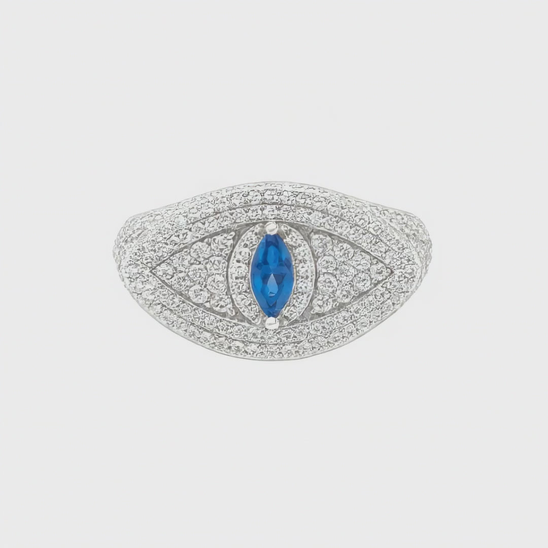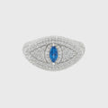 Turn heads and ward off bad vibes with this stunning Evil Eye Statement Ring, crafted in solid 925 sterling silver and set with 2.31CT of lab-created moissanite. The bold pavé design features a brilliant marquise-cut blue stone at the center, symbolizing protection, focus, and fierce style.