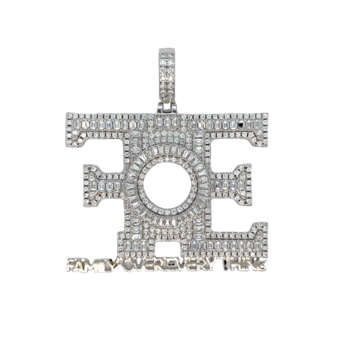925 Sterling Silver Rhodium FAMILY OVER EVERYTHING Pendant, showcases Baguette and Round approx. 5.68CT Moissanite Stones measuring 2*2 inches. Embrace the essence of family with this exquisite and timeless piece. Color: White Silver Rhodium Plated for increased durability. Fast Shipping Worldwide!