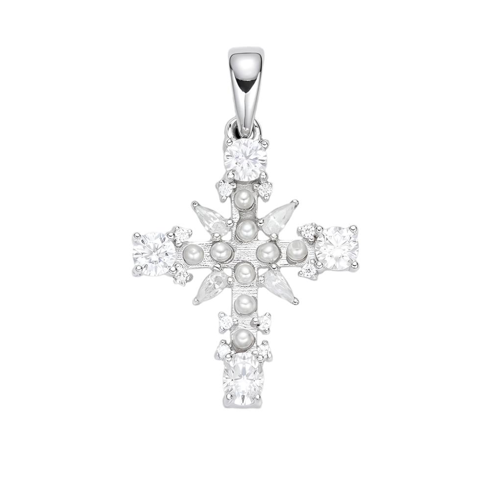 Cross Pearl Lab-Created Moissanite Sterling Silver Charm Pendant - M415899
