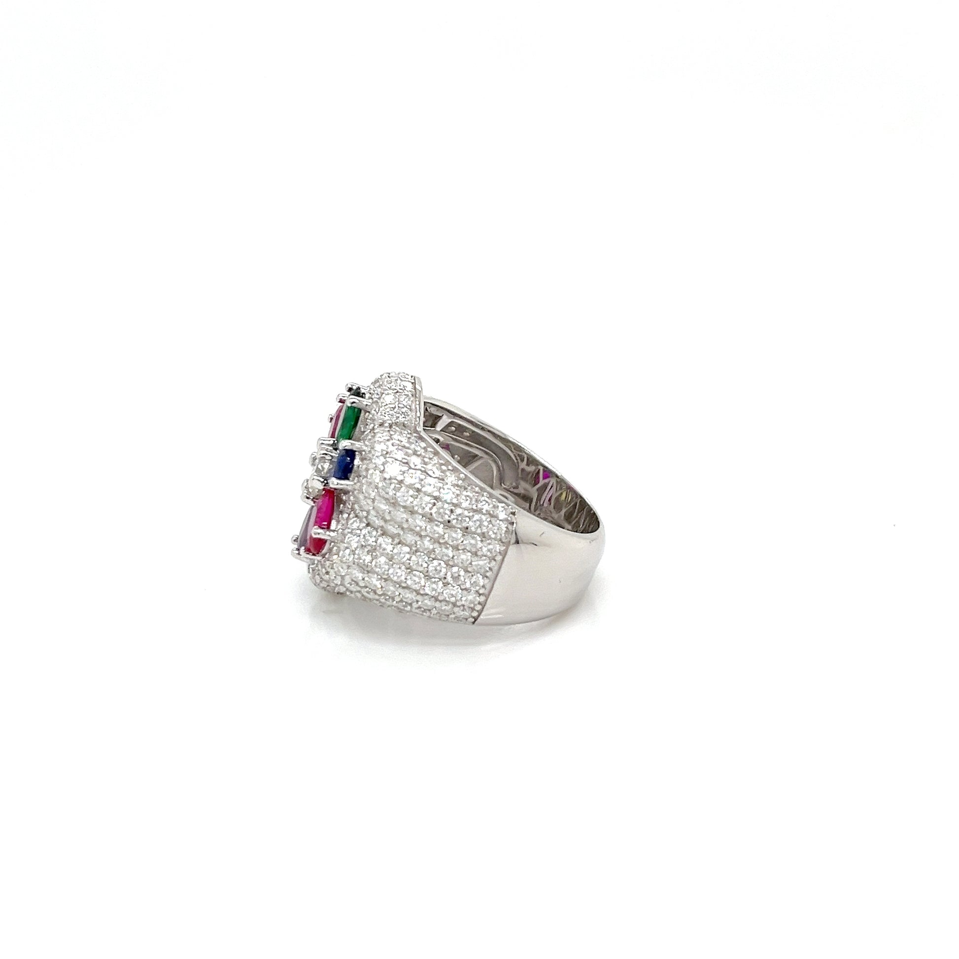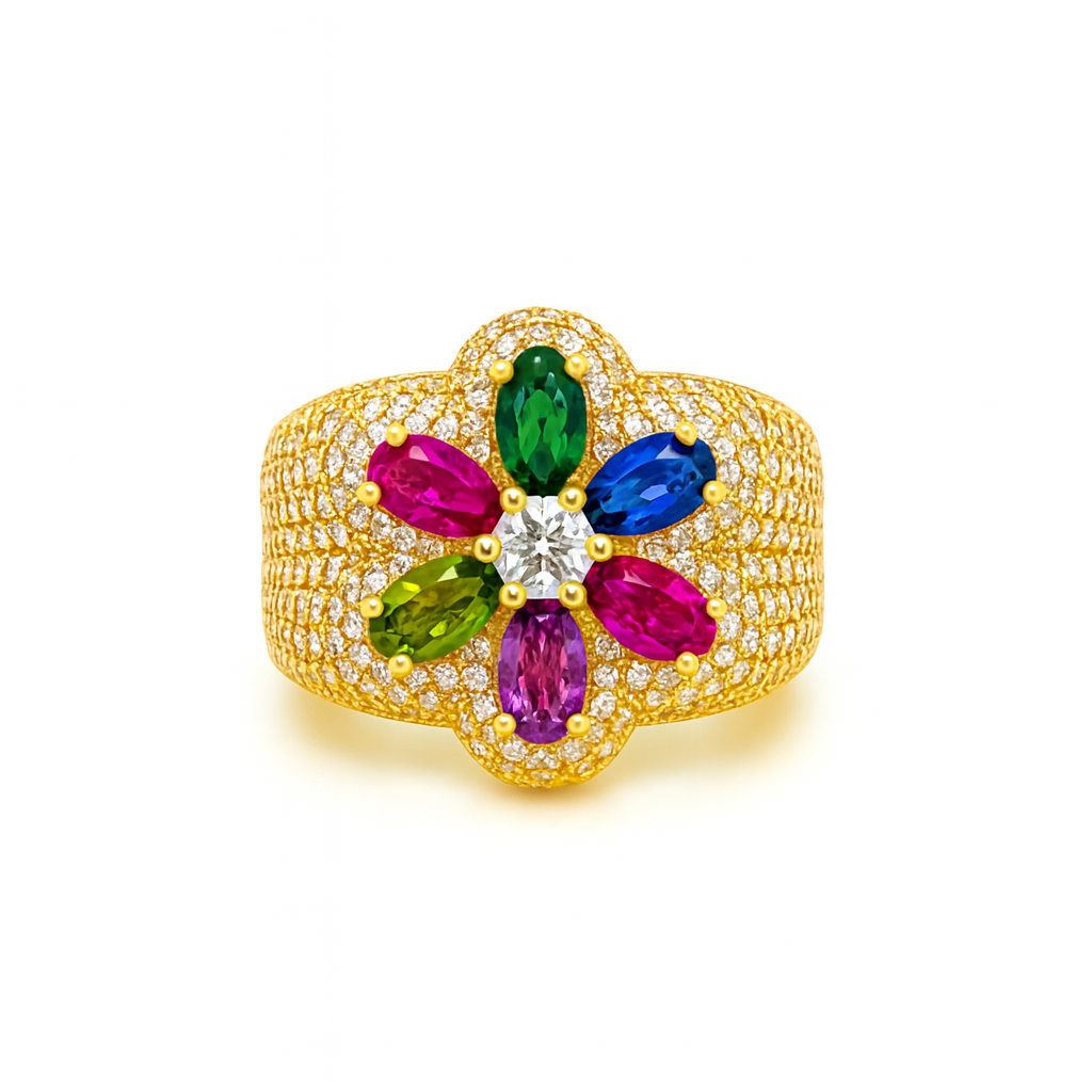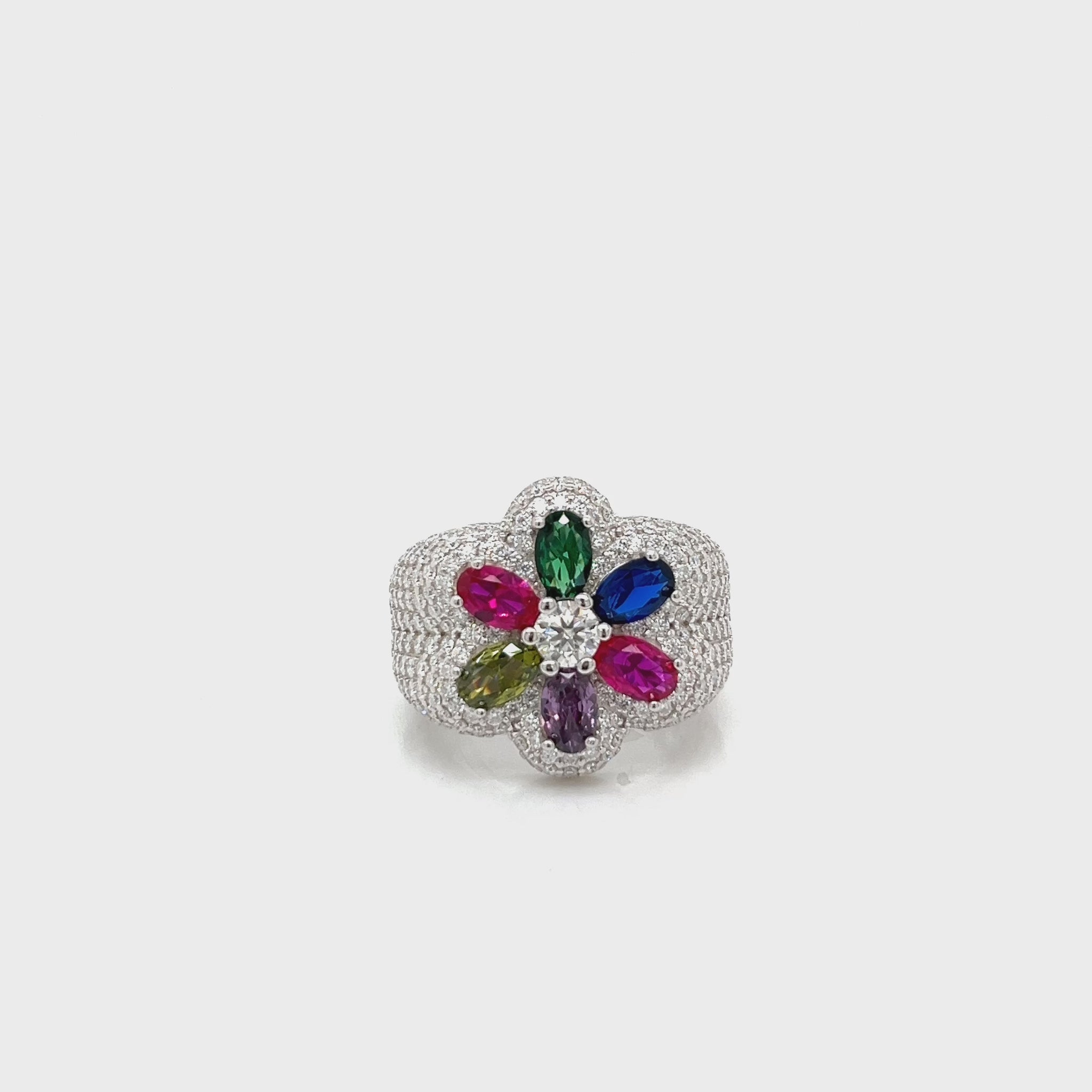 Add a burst of color and brilliance with this sterling silver moissanite floral ring, featuring approximately 3.83ct of stones. The center cluster is surrounded by six marquise-cut multicolor gems, set on a high-polish pave band. Available in silver or gold finish and offered in US sizes 9–11, this piece blends elegance with statement style.