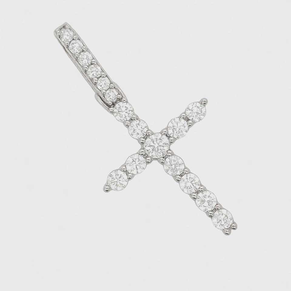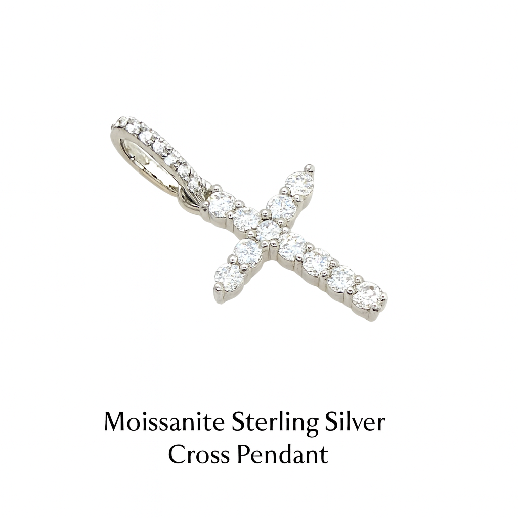 This petite and charming cross pendant sparkles with 0.39CT of lab-created moissanite stones set in sterling silver. At a delicate 1" size, it boasts a timeless cross shape with dazzling brilliance; ideal for daily wear or stacking with your favorites. Finished in white silver with rhodium plating for extra shine and durability.