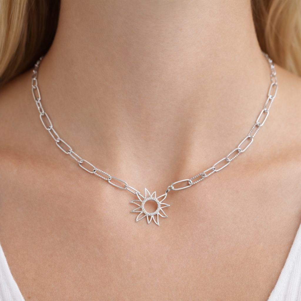 Stunning Sterling Silver Sun Paperclip Lab-Created Moissanite Necklace